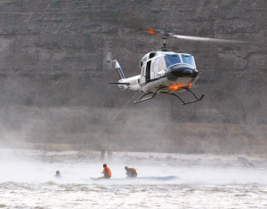 12月8日,救援人员利用救援直升机,设法对被困人员展开营救。黄河水利委员会古贤水利枢纽工程勘探队在黄河山西吉县段作业时,一冲锋舟被湍急的河水冲走掀翻,搁浅在河中岩石上,船上3名工作人员被困。经过当地海事、消防、公安等部门人员长时间营救,3名遇险人员成功获救。 新华社发