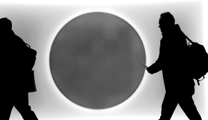 | 在哥本哈根的联合国气候变化大会举办地贝拉中心,两名与会人员从一个模拟太阳的LED发光板前经过。这个展板是为了展示太阳的能量与壮美,呼吁推广太阳能而设立的。 新华社发 |