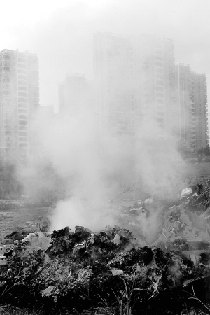 | ←12月9日,海口市紫荆花园附近的空地上,一堆被烧的垃圾升起滚滚浓烟。