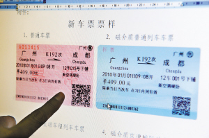 工作人员在介绍车票下方的一维防伪条码将变成一个二维的防伪图案,防伪功能有所加强(12月9日摄)。 2009年12月10日起,铁道部对计算机车票(含磁介质车票)票样将进行修改,原车票正面一维条码改为二维条码,但列车及车站到达补票系统车票不变。新旧车票过渡期截止到2009年12月31日。新华社发