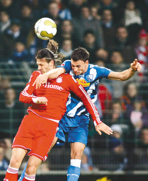 12月13日,当日,在德甲联赛第16轮比赛中,拜仁慕尼黑队客场以5:1战胜波鸿队。图为拜仁慕尼黑队球员德米凯利斯(左)在比赛中争顶头球。新华社发