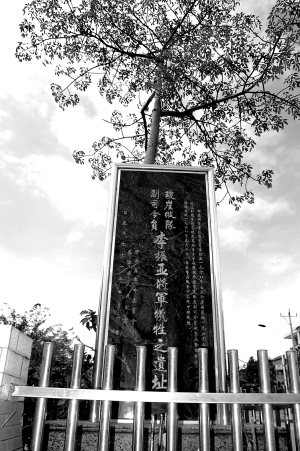 | 万宁市牛漏墟路段,在一株被当地老百姓称为“将军树”的木棉树下,矗立着李振亚将军牺牲遗址的纪念碑。 陈循静 摄 |