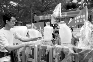 13日上午,我省民间环保人士、海南师范大学教师李波正在海口明珠广场摆设冰雕。 当天上午,数十名环保志愿者在这里通过用冰块雕成北极熊、冰山、企鹅等形状并将其现场融化的方式,向市民介绍气候变暖的危害,倡导爱护环境的重要意义。现场还设置了图片宣传展板并向市民发放宣传环保小册子。该活动是省国土环境资源厅和海南部分大学的环保志愿者们共同发起举办的。 本报记者 古月 摄