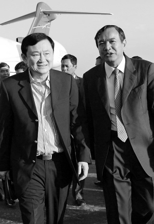 12月13日,泰国前首相他信(左)乘坐私人飞机抵达柬埔寨首都金边。他信当日再次访问柬埔寨并探视即将获释的泰国工程师。今年11月4日,柬埔寨宣布正式任命他信为柬首相洪森和柬王国政府顾问。 新华社/法新