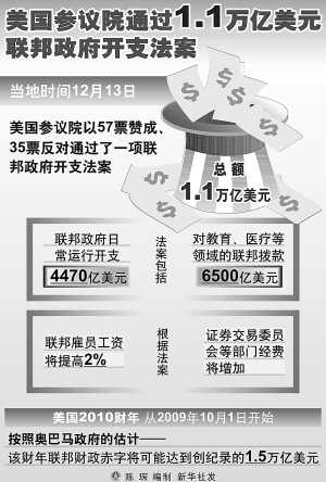 对于这一庞大的开支,共和党议员予以强烈反对。他们认为,当前美国联邦赤字过高,如此规模的开支难以为继,会使国家陷入灾难。但民主党议员则认为,要使美国经济尽快走出衰退,这种开支规模是必须的。 由于民主党在国会占据多数席位,尽管遭到共和党的抵制,1.1万亿美元的开支法案仍先后在众议院和参议院获得通过。该法案送交美国总统奥巴马签字即可生效。 新华社发
