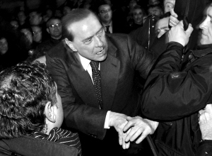 | 贝卢斯科尼在人们的簇拥下离开政治集会现场。