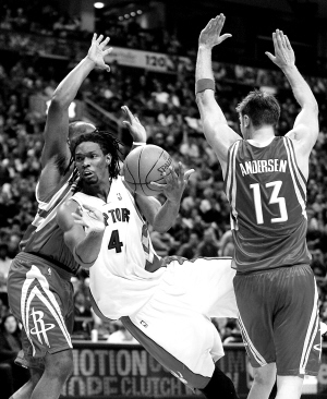 12月14日,在NBA常规赛中,猛龙队以101:88胜火箭队。图为猛龙队球员波什(中)在比赛中带球突破。新华社发