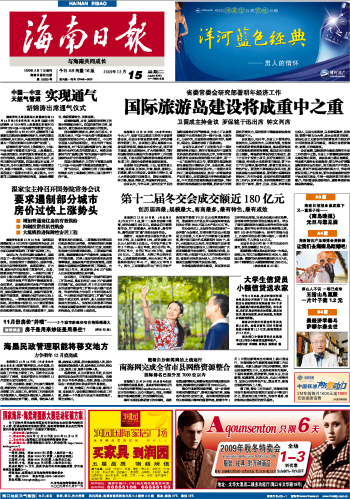 海南日报 头版 001 2009-12-151 2009年12月15日 星期二