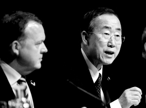 12月15日,在丹麦首都哥本哈根,联合国秘书长潘基文(右)出席联合国气候变化大会高层会议开幕后的新闻发布会。当天,哥本哈根气候变化大会开始进入更加关键的高层会议。潘基文在高层会议开幕式上发表讲话说,现在是与会各国寻求共识的时候,哥本哈根大会的目标是为最早于明年达成一份有法律约束力的条约奠定基础。潘基文在会后举行的新闻发布会上进一步解释说,一旦在此次哥本哈根大会上达成“公平、雄心勃勃、全面”的政治协议,那么就应该尽快将其上升为具有法律约束力的协议。