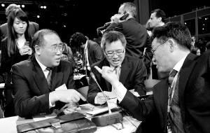 | 12月15日,在丹麦首都哥本哈根,中国代表团团长解振华(左)、代表团副团长苏伟(中)与联合国副秘书长沙祖康在联合国气候变化大会高层会议开幕式上交谈。当天,气候变化大会开始进入高层会议阶段。