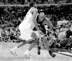 | 16日,NBA常规赛中,湖人队客场以96比87战胜公牛队。图为科比(右)在比赛中带球突破。