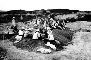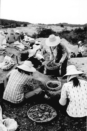 这是1986年在东方县(今东方市)不磨岭上拍摄的一张照片。照片中的人们拿着钢钎、锄镐、簸箕等工具,埋头采挖石头,这不是普通的石头,而是含有黄金的矿石。