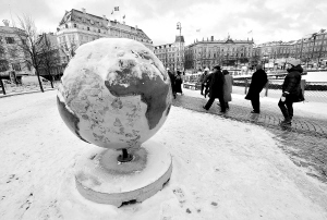 ← 12月17日,在丹麦首都哥本哈根,市民从宣传防止气候变化的地球模型旁走过。 新华社记者 武巍 摄