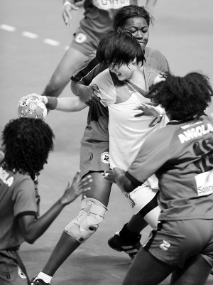 17日,在世界女子手球锦标赛排位赛中,中国队以25比26负于安哥拉队,获得第12名。图为沙正文(中)在比赛中进攻。 新华社发