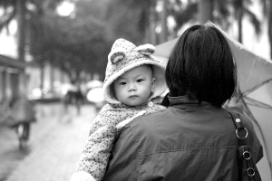 17日下午,海口市海府路一位市民抱着身穿棉衣的孩子在小雨中行走。当天海口气温骤降,一些小孩和老年市民纷纷穿起冬装。 本报记者 古月 摄