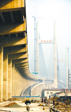 目前,世界跨径最大的双塔双索面双层公路斜拉桥———上海闵浦大桥正进行最后阶段的路面维护和设备调试,将于12月底建成通车。上海闵浦大桥位于奉浦大桥与徐浦大桥之间,是跨越黄浦江的第八座大桥,整桥全长3982.7米,大桥主跨达708米,上层为设计时速120公里的双向8车道高速公路;下层为双向6车道普通公路。闵浦大桥建成后,将为世博会交通提供便捷通道,并可从浦东国际机场直达浙江嘉兴、湖州地区,对沪杭两地乃至长三角区域的经济社会协调发展具有重大意义。 新华社发