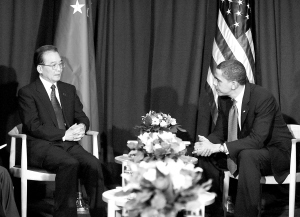 | 十二月十八日,国务院总理温家宝在哥本哈根会见美国总统奥巴马。 新华社发 |