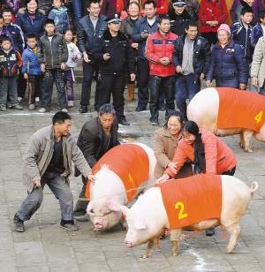 12月20日,四川雅安上里古镇“年猪节”举行了“年猪竞速”比赛和“年猪王”评选活动。图为“年猪竞速”比赛现场。 新华社发