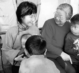 | 2009年11月,电视剧《毛岸英》在杨开慧的故乡湖南板仓热拍,刘思齐探望剧组人员时和剧中扮演杨开慧的青年演员张舒羽交谈。(资料图片) |