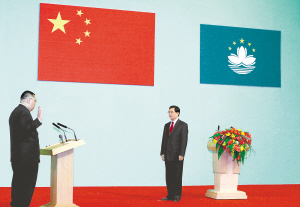 | 在澳门特别行政区第三届政府就职典礼上,胡锦涛总书记监誓,澳门特别行政区第三任行政长官崔世安宣誓就职。 新华社记者 鞠鹏 摄 |