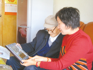 | 达娅拿出新加坡赠送机工后代的纪念章给王亚六老人观看。小范摄 |