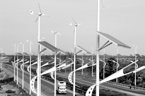在新开发区安装节能路灯,可取得美观与节能减排双赢的效果。三亚市海棠湾今年安装了1600多盏“风-光互补”节能路灯,它们采用风能和太阳能双保险供电,即使在阴雨天也不受影响。新路灯,不仅节约能源,扮靓道路景观。 新华社发