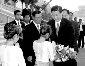 12月21日,中国国家副主席习近平在金边柬政府办公大楼与柬埔寨首相洪森举行会谈。这是会谈前,在洪森首相举行的欢迎仪式上,柬埔寨少女向习近平献花。 新华社记者马占成摄