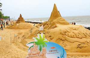 12月21日,海口假日海滩海边凛凛寒风中的沙雕和游客。 当天,2009国际沙滩狂欢季活动在海口假日海滩开幕。狂欢季是在2009亚洲沙滩排球锦标赛期间推出的一项群众性文娱活动,活动为期两周,游客可免费体验沙滩掘宝、椰岛橄榄球等娱乐项目。本报记者 古月 摄