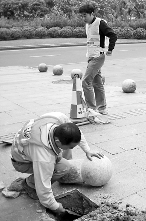 海口街头的“阻车球”遭到严重的人为破坏。12月20日,海口市政维修人员在龙昆南路补装“阻车球”。 本报记者 古月 摄