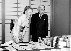 这张日本宫内厅12月23日提供的照片显示,日本天皇明仁和皇后观看民众为庆祝他即位20周年(12月11日)写的贺词。当日,日本天皇明仁迎来他的76岁生日。 新华社/法新