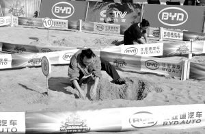 | 在沙排亚锦赛期间,组委会还推出了“国际沙滩狂欢季”活动。图为12月23日,市民在海口市西海岸参与“沙滩掘宝”游戏活动。 本报记者 宋国强 摄 |