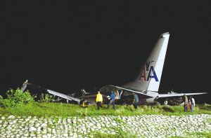 B4版 降落时冲出跑道 美航客机 在牙买加 断成两半 91人受伤,原因可能是事发时强降雨天气影响飞行员未能找准降落点