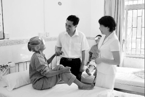 | 12月4日,海口手术点, 省人民医院副院长、眼科医院负责人牟忠林(中)在看望做完手术的白内障患者。