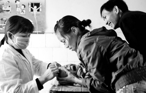 ↑ 12月3日上午,两位参合的农村夫妇,在澄迈县福山镇敦茶村委会卫生室带患病孩子治病。