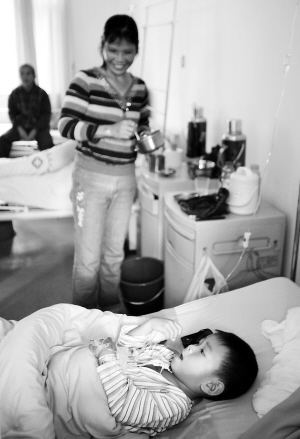 ↓ 12月4日下午,黄达勇在五指山市省第二人民医院惠民病房床上等待妈妈喂食物,接受了肛管息肉手术的黄达勇,健康恢复得很快。