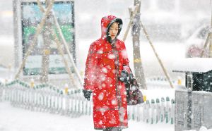 12月23日,乌鲁木齐一位市民顶风冒雪走在光明路上。 新华社记者 赵戈 摄