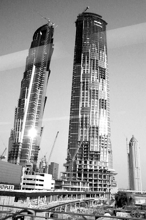 Burj Dubai可谓是楼市繁荣的见证,它简直就是个大工地。各式摩天大楼争奇斗艳,有的像双子塔、有的像要腾空的火箭。连同高耸入云的迪拜塔,它们都有一个共同点:全部未对外开放,现场看不到施工者,大楼上的起重机也被晾晒在一边。