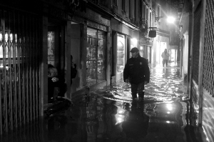 12月23日,在意大利“水城”威尼斯,一名消防员走在被洪水淹没的街道上。威尼斯遭遇今年以来最大洪水侵袭,城区水位最高1.43米。当地水文监测部门说,受风雨天气和周期性潮汐影响,洪水致使威尼斯全城56%陆地受淹。 新华社/法新