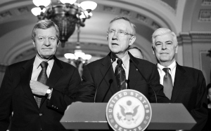 12月24日,美国国会参议员多数党领袖、民主党参议员哈里·里德(中)在投票后出席记者会。美国国会参议院24日清晨投票通过了美国总统奥巴马支持的全面医疗改革法案。法案的核心是创建一个联邦监管的医疗保险市场,而政府将成立公共保险机构出售医疗保险。 新华社记者张岩摄