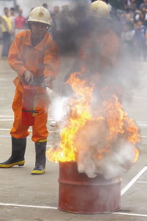 2009年12月24日,农村消防员在表演扑救油盆火灾。 当天,“走千家,进万户———海南省冬季防火宣传活动”启动仪式在海口市长流镇传桂村举行。在启动仪式上,消防人员通过家庭火灾扑救演示、发放消防宣传资料等方式,让广大群众积极投身冬季防火活动中,切实减少冬季火灾危害,同时提高基本的自防自救和组织人员疏散的能力,确保社会安全稳定。据了解,此次冬季防火宣传活动将为期三个月。 本报记者马春华/文 宋国强/图