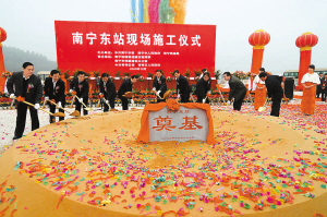 12月27日,云桂铁路广西段、南宁东站、玉林至铁山港铁路、广西沿海铁路黎塘至钦州段扩能改造工程、广西钦州临海园区地方铁路支线大榄坪至保税港区段等5个铁路项目在广西同时开工。今年广西将实现新建和续建铁路20条,建设里程近3000公里。 新华社发