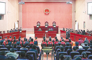 | 这是12月29日的庭审现场。当日,重庆市第五中级人民法院对黎强等31人涉黑案一审公开宣判。