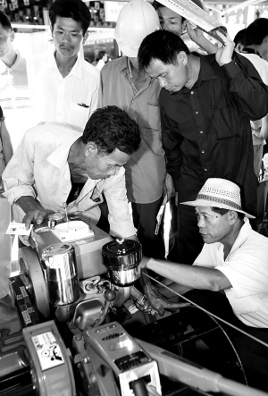 几位农民看上了小型多功能拖拉机。 本报记者 苏晓杰 摄