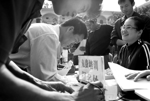 农民积极报名参加“送岗位”、“送培训”为主要内容的服务活动。 本报记者 王凯 摄