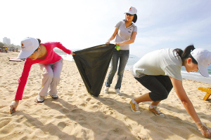 | 7月10日,100多名志愿者正在三亚沙滩进行清洁。 |