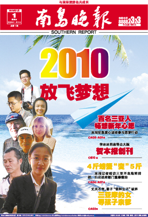 本报海口12月31日讯 (南岛晚报记者唐龙波)伴随着2010年的第一缕阳光,在中国最有热度的城市———三亚,《南岛晚报》———中国最南端城市的第一张市民报,终于诞生了。第一期《南岛晚报》有4个漂亮封面和40个新闻版,与《南国都市报》同步发行。