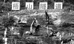 | 2009年12月31日,工程机械在合(肥)福(州)铁路客运专线福建段梧山隧道现场作业。 新华社记者 张国俊 摄 |