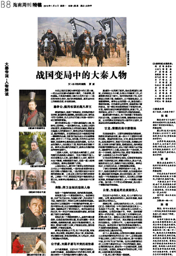 大型古装历史剧《大秦帝国》中的主要人物,一反过去历史剧中的脸谱化倾向,个性鲜明,层次感强。尤其是在塑造人物内心世界方面———他们的冲突与竞争,他们的厚重隐忍,甚至面对死亡的淡然自若,令观者动容。