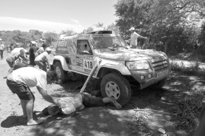 在3日进行的达喀尔拉力赛揭幕赛段比赛中,一辆参赛车辆意外冲出赛道,撞入赛道边上的观众群,致使一名女性观众死亡,7名观众受伤。图为现场观众救助受伤人员。 新华社发
