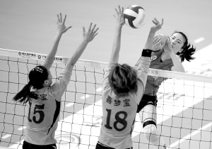 3日,在全国女排联赛B组第九轮比赛中,郎平率领广东恒大队主场以3:0战胜福建厦门喜梦宝队,收获八连胜,继续占据联赛榜首。图为广东恒大女排球员周苏红在比赛中扣球。 新华社发